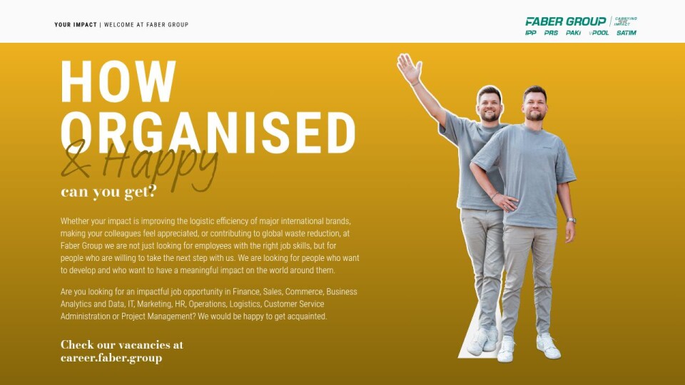 Whether your impact is improving the logistic efficiency of major international brands, making your colleagues feel appreciated, or contributing to global waste reduction, at Faber Group we are not just looking for employees with the right job skills, but for people who are willing to take the next step with us. We are looking for people who want to develop and who want to have a meaningful impact on the world around them.