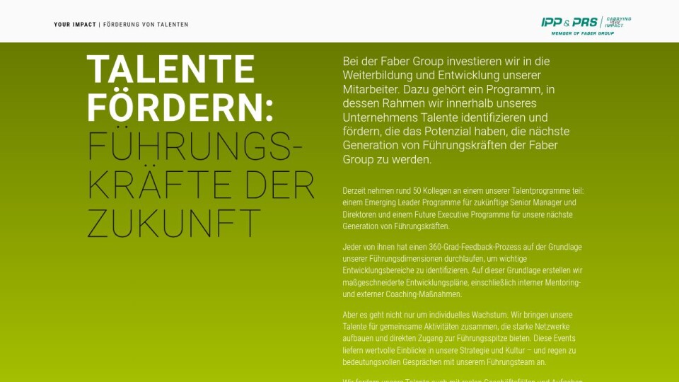 Bei der Faber Group investieren wir in die Weiterbildung und Entwicklung unserer Mitarbeiter. Dazu gehört ein Programm, in dessen Rahmen wir innerhalb unseres Unternehmens Talente identifizieren und fördern, die das Potenzial haben, die nächste Generation von Führungskräften der Faber Group zu werden.