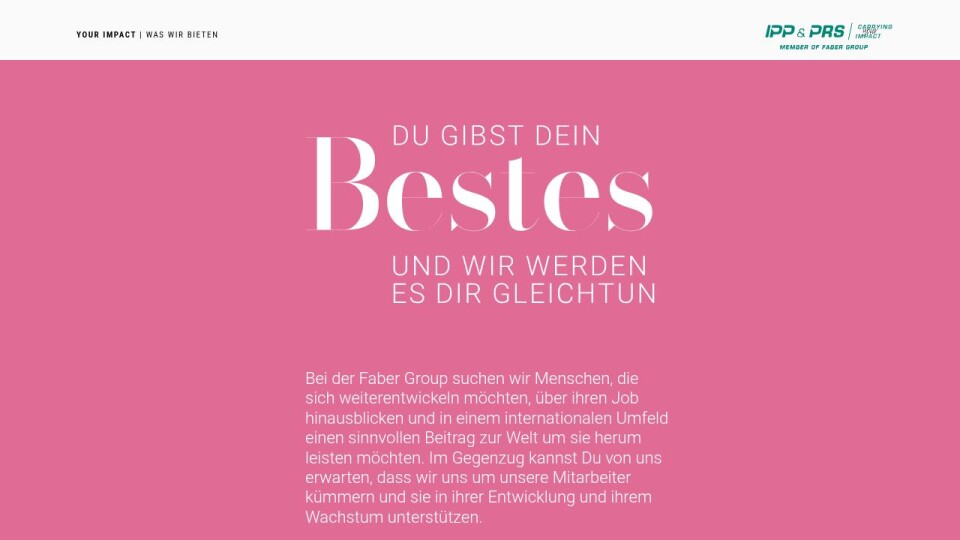 Bei der Faber Group suchen wir Menschen, die sich weiterentwickeln möchten, über ihren Job hinausblicken und in einem internationalen Umfeld einen sinnvollen Beitrag zur Welt um sie herum leisten möchten. Im Gegenzug kannst Du von uns erwarten, dass wir uns um unsere Mitarbeiter kümmern und sie in ihrer Entwicklung und ihrem Wachstum unterstützen.