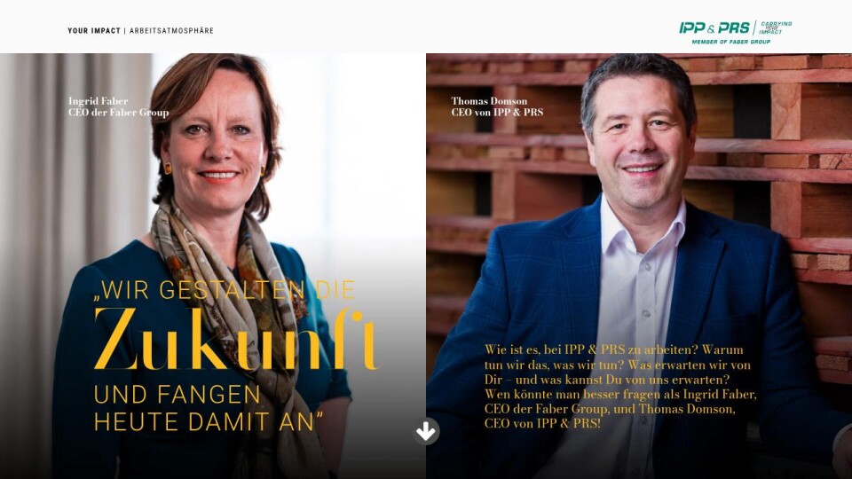 Wie ist es, bei IPP & PRS zu arbeiten? Warum tun wir das, was wir tun? Was erwarten wir von Dir – und was kannst Du von uns erwarten? Wen könnte man besser fragen als Ingrid Faber, CEO der Faber Group, und Thomas Domson, CEO von IPP & PRS!