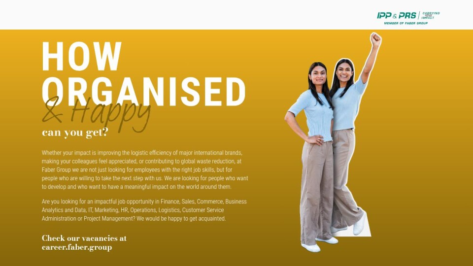 Whether your impact is improving the logistic efficiency of major international brands, making your colleagues feel appreciated, or contributing to global waste reduction, at Faber Group we are not just looking for employees with the right job skills, but for people who are willing to take the next step with us. We are looking for people who want to develop and who want to have a meaningful impact on the world around them.