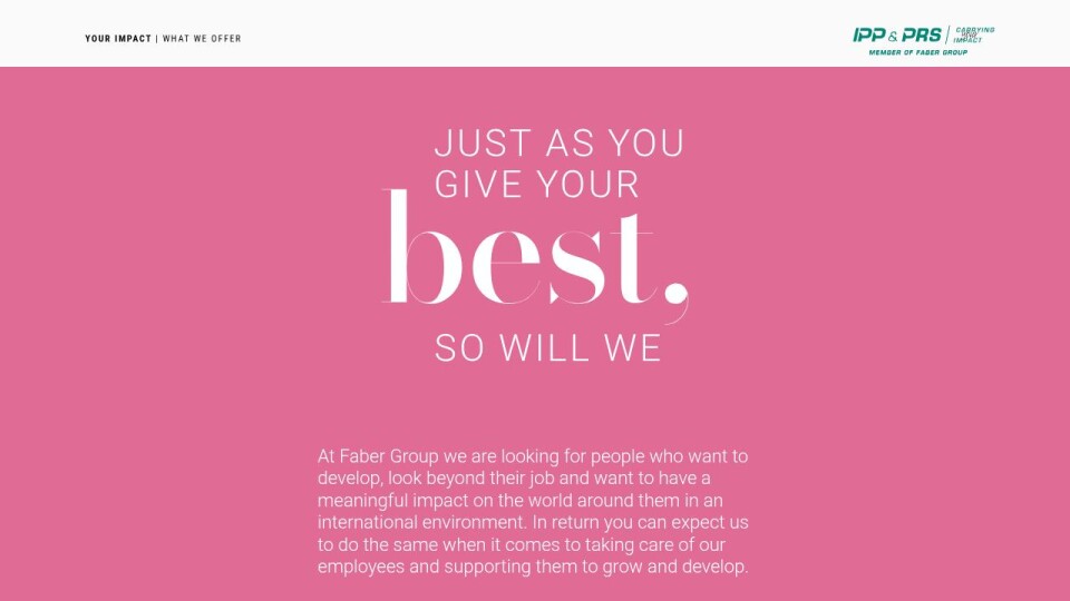 At Faber Group we are looking for people who want to develop, look beyond their job and want to have a meaningful impact on the world around them in an international environment. In return you can expect us to do the same when it comes to taking care of our employees and supporting them to grow and develop.