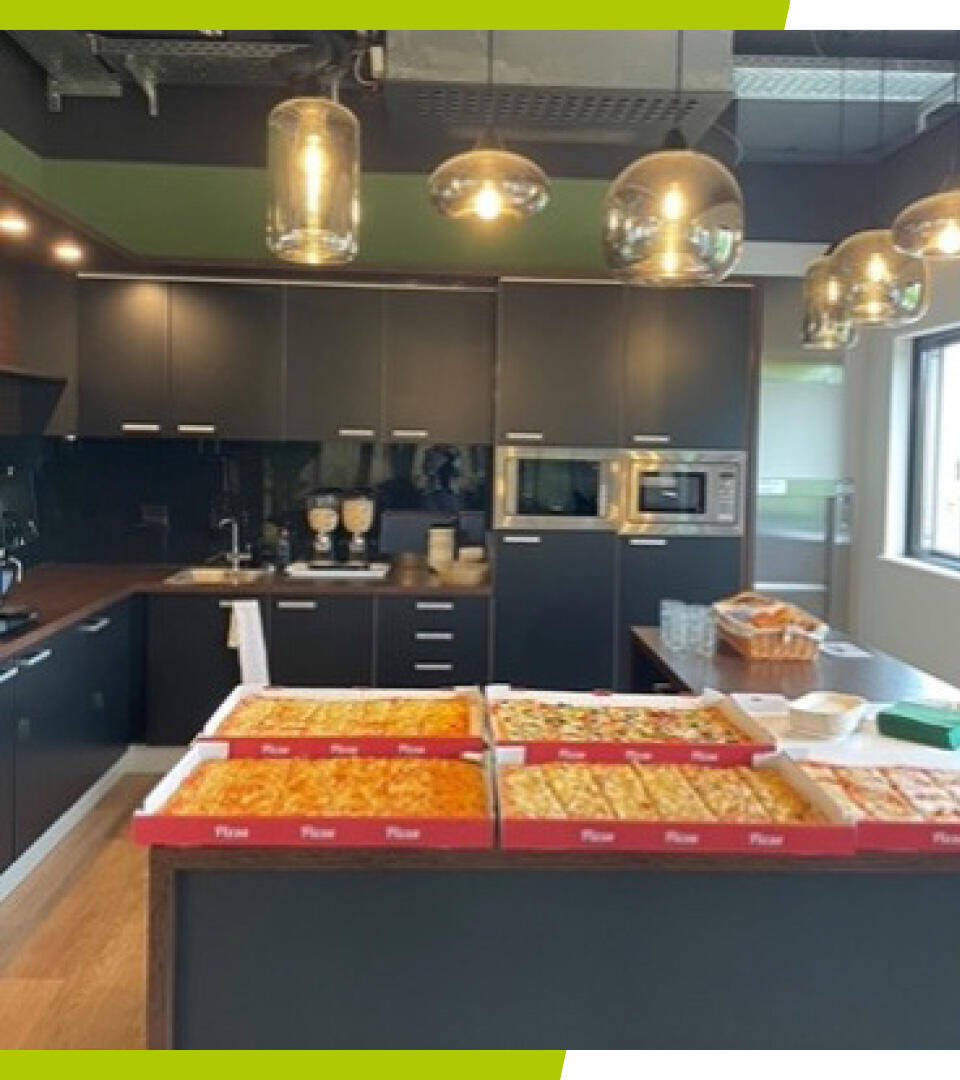 Pizza-Zeit! Wir nehmen uns viel Zeit für informelle Veranstaltungen oder kleine Feiern. Darüber hinaus veranstalten wir jährlich eine Sommerparty mit allen PAKi-Kollegen aus allen Ländern und lokale Weihnachtsfeiern in allen Büros.