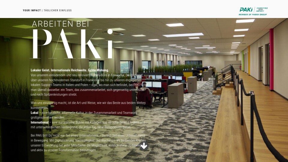 Bei PAKi bist Du nicht nur Teil eines Unternehmens – Du bist Teil eines Unternehmens in Bewegung. Mit Digitalisierung, Nachhaltigkeit und Wachstum als treibenden Kräften unserer Entwicklung hat jeder Mitarbeiter die Möglichkeit, wirklich etwas zu bewegen und aktiv zu unserer Transformation beizutragen.
