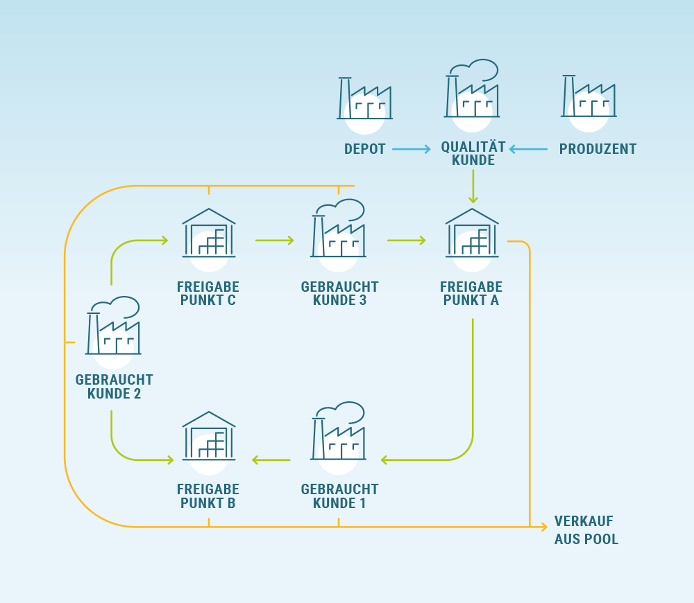 Open Pooling, wie es von PAKi genutzt wird, ist ein System zur Wiederverwendung, bei dem wiederverwendbare, austauschbare Ladungsträger unter einer unbestimmten Anzahl von Systempartnern zirkulieren. Aufgrund der Austauschbarkeit der Ladungsträger wird das „normale“ Eigentumsrecht durch das „Rückgaberecht“ eines ähnlichen Ladungsträgers ersetzt.