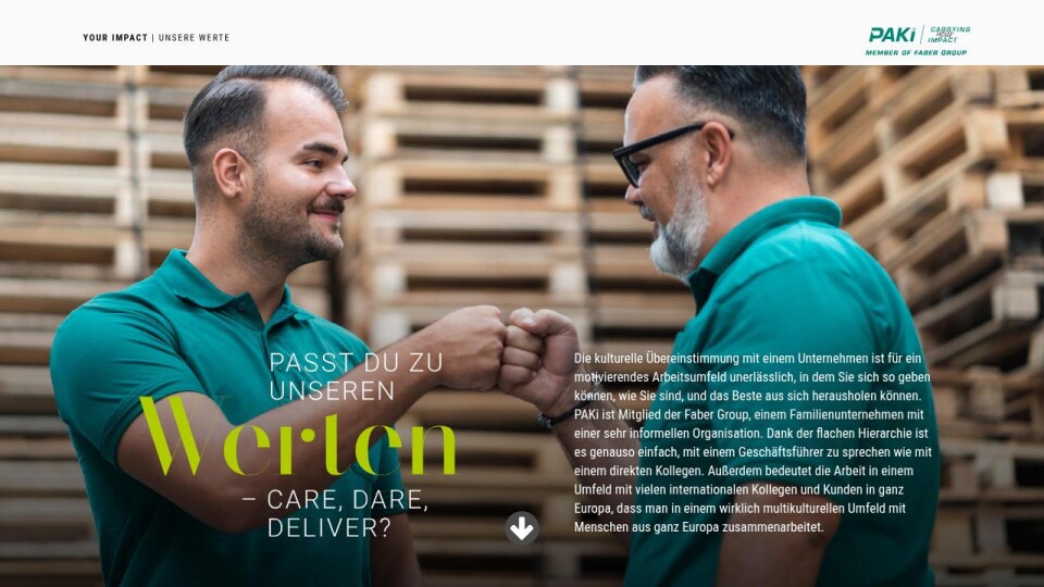 Die kulturelle Übereinstimmung mit einem Unternehmen ist für ein motivierendes Arbeitsumfeld unerlässlich, in dem Sie sich so geben können, wie Sie sind, und das Beste aus sich herausholen können. PAKi ist Mitglied der Faber Group, einem Familienunternehmen mit einer sehr informellen Organisation. Dank der flachen Hierarchie ist es genauso einfach, mit einem Geschäftsführer zu sprechen wie mit einem direkten Kollegen. Außerdem bedeutet die Arbeit in einem Umfeld mit vielen internationalen Kollegen und Kunden in ganz Europa, dass man in einem wirklich multikulturellen Umfeld mit Menschen aus ganz Europa zusammenarbeitet.