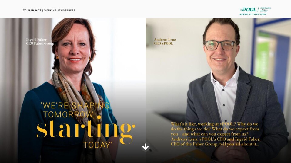 What’s it like, working at vPOOL? Why do we do the things we do? What do we expect from you – and what can you expect from us? Andreas Lenz, vPOOL’s CEO and Ingrid Faber, CEO of the Faber Group, tell you all about it…